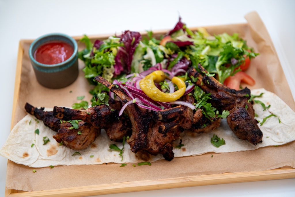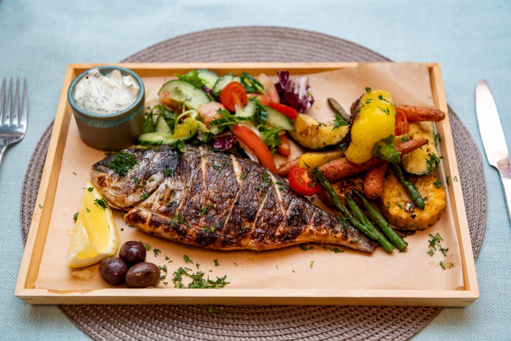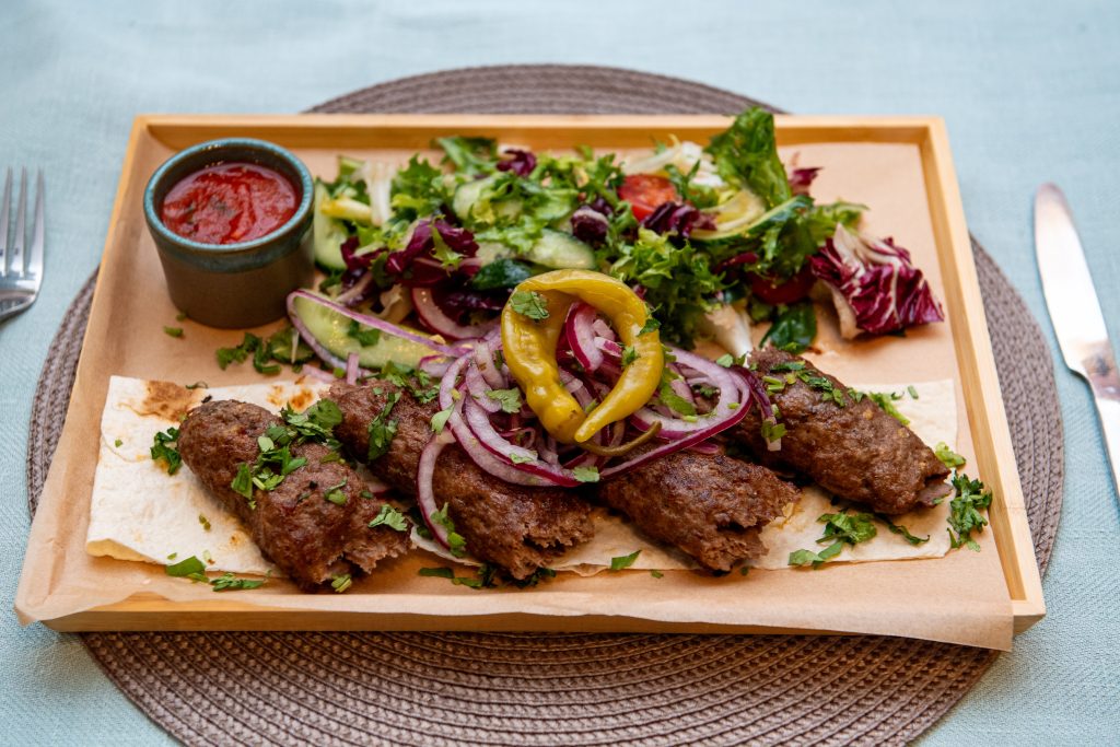 Liellopa–jēra gaļas ļuļa kebabs vai uz oglēm grilēte vesela skumbrija vai uz oglēm grilēta vesela dorāda