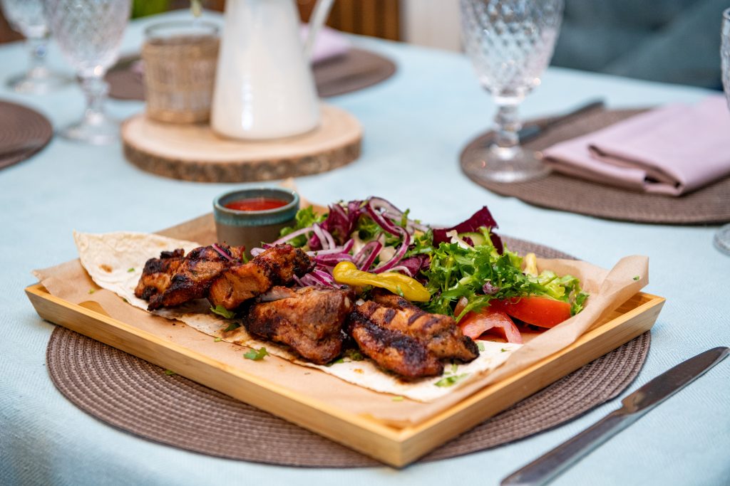 Uz oglēm grilēts vistas gaļas šašliks